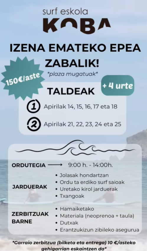 Informazio eta erreserbak: kobasurfeskola@gmail.com emailean, 620 68 57 53 telefonoan edo https://kobasurfeskola.com/#Services web gunean.